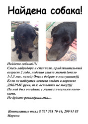 Найдена собака!!!! Смесь лабрадора и спаниеля, приблизительный возраст 2 года, недавно стала мамой (около 1-1, 5 мес. назад) Очень добрая и послушная))) Если не найдутся хозяева отдам в хорошие ДОБРЫЕ руки, т.